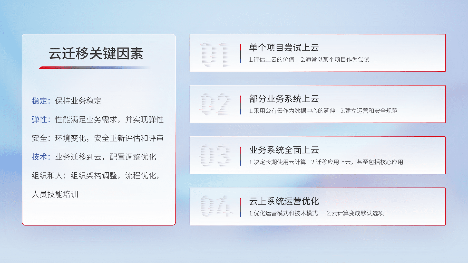 结合实际业务,,从规划设计、、、、云平台选型、、、云原生改造、、、、数据迁移、、、集成交付,,迁移全过程为客户识别最佳上云路径,,做好风险识别管理,,,设计网络架构、、身份权限、、、安全审计合规、、、操作审计、、、、日志审计、、监控告警策略、、、多站点容灾设计等,,,对云上基础设施进行整体规划,,,,提升IT治理水平,,,以满足弹性、、、高可用、、高性能的需求。。。