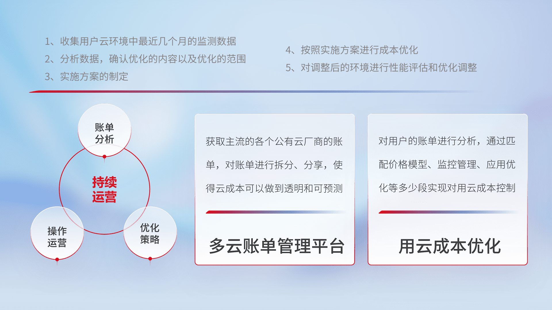 通过多云纳管,,,以统一的资源数据模型把客户的云资源进行抽象和封装,,,,进而实现对多云资源的统一操作,,保障云资源管理的可靠性、、、稳定性与可用性。。量身定制化运维内容,,,配置、、、、开发运维、、、、补丁管理、、、、备份、、监控、、认证和访问管理、、审计和日常巡检等,,保障在用云过程中的可靠度,,,,稳定度以及高可用率。。。。